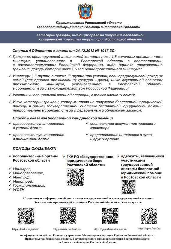 Порядок и случаи оказания гражданам бесплатной юридической помощи установлены Федеральным законом от 21.11.2011 № 324-ФЗ «О бесплатной юридической помощи в Российской Федерации» и Областным законом Ростовской области от 24.12.2012 № 1017-ЗС «О бесплатной юридической помощи в Ростовской области» (далее – Областной закон).