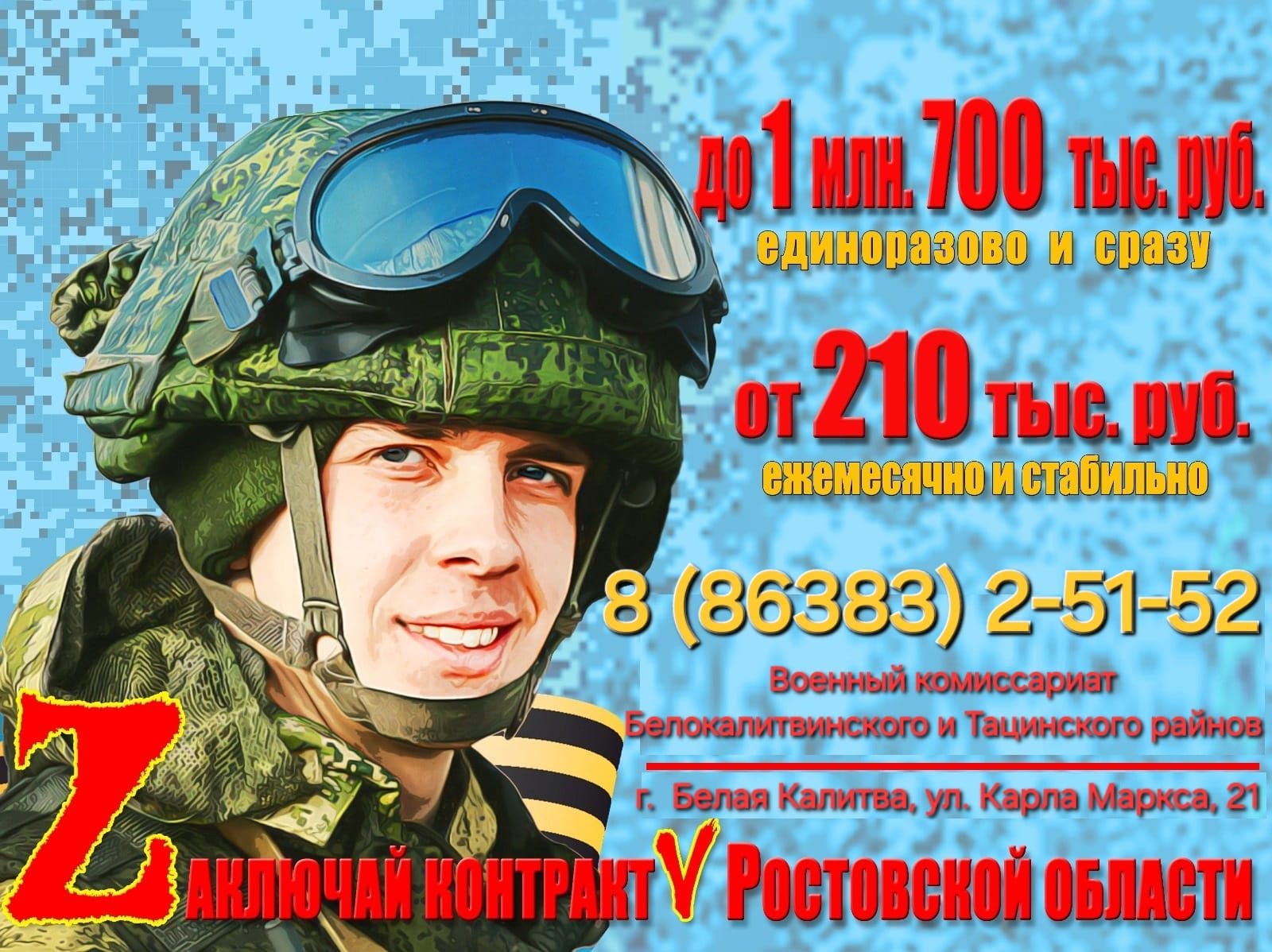 Для заключения контракта необходимо обращаться в военный комиссариат Белокалитвинского и Тацинского районов Ростовской области по телефону 8(86383) 2-51-52.